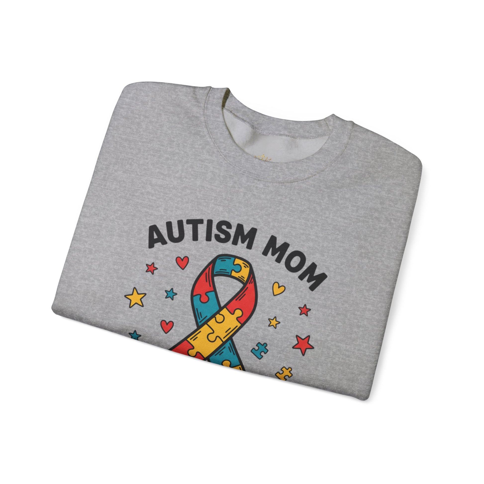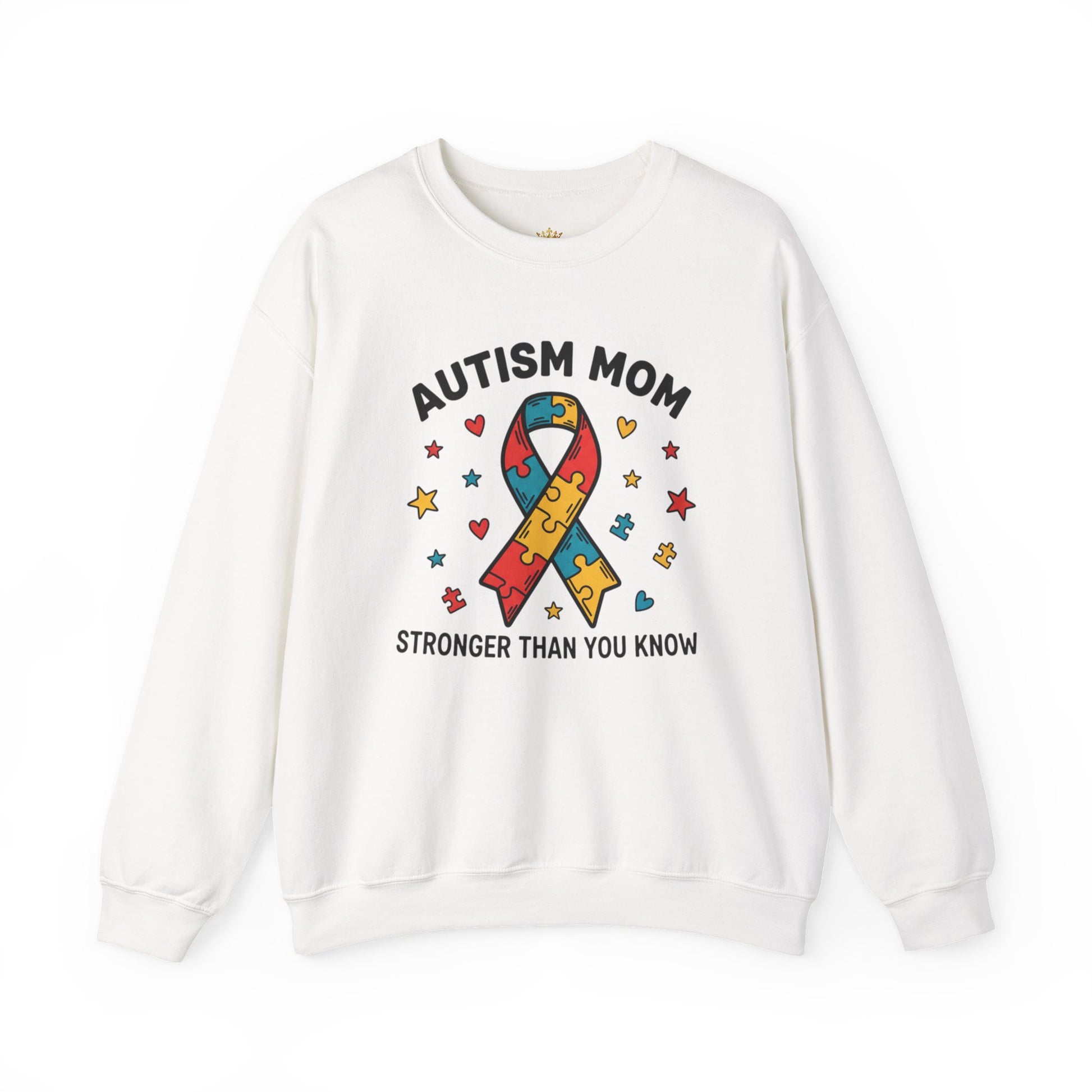 This sweatshirt carries a clear, heartfelt message of strength and love. A bold puzzle-piece ribbon in autism-awareness colors—red, yellow, blue, and teal—takes center stage, surrounded by hand-drawn hearts, stars, and tiny puzzle pieces that feel personal and tender. The stacked lettering, “AUTISM MOM – STRONGER THAN YOU KNOW,” reads like a steady, proud declaration. Worn around school events, therapy appointments, support-group meetups, or quiet mornings at home, it’s a garment that quietly says: you carry courage every day. The clean vector lines and high-contrast artwork stand out on the white fabric, while thoughtful construction—soft medium-heavy cotton blend, ribbed collar, and reinforced seams—keeps this sweatshirt comfortable and durable through daily wear. Subtle options like chest or wrist embroidery and a DTF inner neck label add quality details that make it feel made for real life and real love.